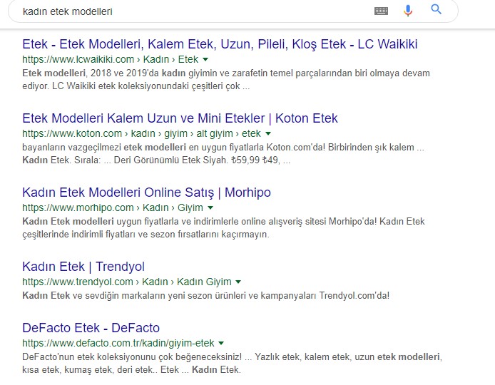 ‘‘ Kadın etek modelleri’’ ni Google’da aradığımızda ilk 5 giyim markasının içeriklerini inceleyelim. Genelde e-ticaret sitesi olduklarından dolayı içerikler ve formatları birbirine benzer.