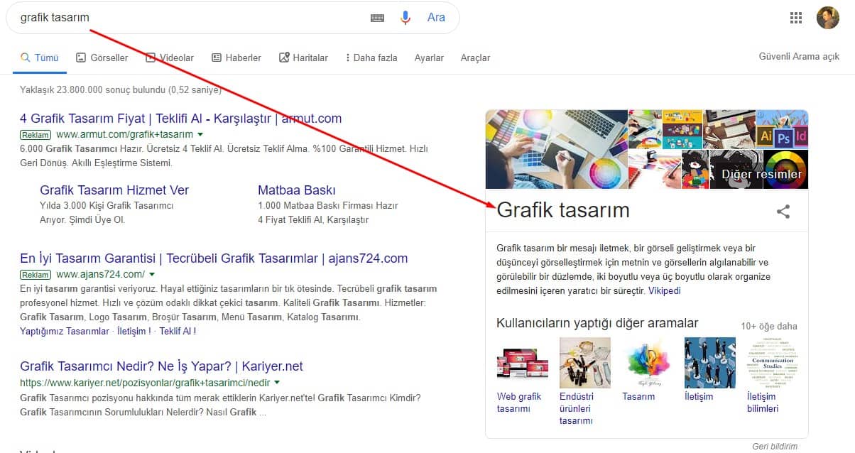 Bilgi panelleri (the knowledge panels) yeni başlayanlar için görünürlükte artış sağladı. Daha önce ‘‘ Grafik Tasarım’’ anahtar kelimesindeki içerikler featured snippets’’ de’ iken şimdi bilgi paneline geçti.