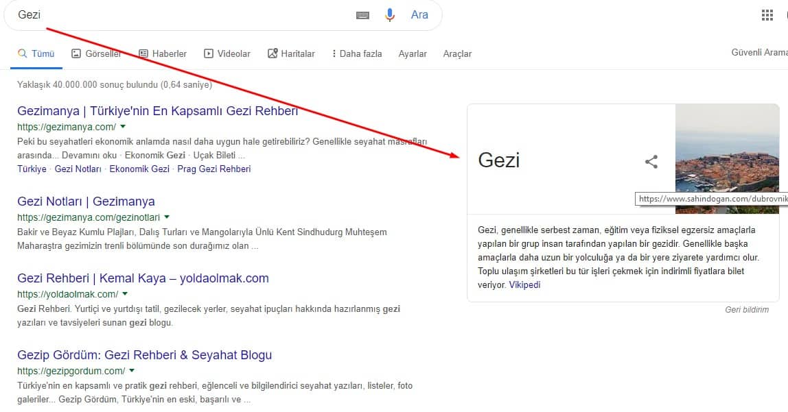 Google’da ‘‘Gezi’’ anahtar kelimesinde yaptığımız arama sonuçlarında bir zamanlar gezi ile alakalı bloglar veya siteler yer alırken artık Google içeriği direkt SERP’e taşıyor.