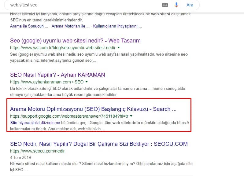 Örneğin Google SERP’de şuna bakalım [web sitesi SEO]: