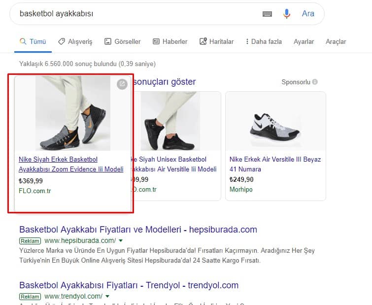Örneğin, ‘‘basketbol ayakkabısı’’ araması yaparak Google Adwords reklamlarına bakalım.